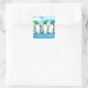 A festive sticker for Christmas featuring three singing penguins in green holiday hats with floating musical notes and fish swimming under the ice illustrated with ink and painted with watercolor.