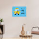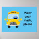Mask reminder poster for school children featuring a masked monster driving a yellow school bus.