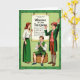 Designed with a festive border of shamrocks, this St. Patrick’s Day scene shows three friends gathered around a large scroll of sheet music, setting a cozy, old-fashioned mood 💚. The scroll sits prominently in the middle and is titled “Wearing of the Green” in dark lettering that stands out against the pale paper. At center, a man in an emerald long coat and reddish-pink waistcoat lifts one hand as if guiding the tune, his face turned toward the others like he’s sharing a favorite chorus. Beside him, an auburn-haired woman in a flowing green skirt and white blouse leans in with an affectionate, attentive look, her hands poised as though she’s about to sing along ☘️. In the foreground, a young boy perches on a wicker basket, studying the silver flute in his hands with quiet focus, ready to join the group. The background is washed in layered greens, while warm reds and browns appear in small details like clothing accents and shoes, giving the picture a gentle contrast. The shamrock border frames the trio all around, with little clovers repeating along the edges.