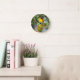 Wall clock with funny image of a yellow weaver bird building a nest.