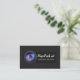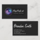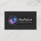 A simple and modern design with an illustration of a camera lens. Your company name in a white colour script font and a brief description of your services tucked in underneath in a light grey colour all placed on a clean black rectangle area with a grey textured background. Place your contact information on the back side in matching fonts and colours. This is a very modern and professional looking business card that can work for a photographer and or website designer.