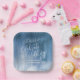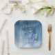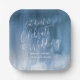 Grey blue muted toned modern abstract art painted wedding paper plates. Typographical text reads Eat, drink & celebrate the wedding of then add your own names underneath. A great personalized addition to your wedding buffet or party tables. Other matching items and colours available in this design. © Original watercolor art and design by Sarah Trett www.sarahtrett.com for www.mylittleedenweddings.com