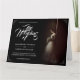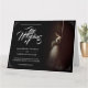 Wedding announcement with the image of a dreamy bride leaning against a wall with a bouquet of white flowers in the penumbra - classic style.