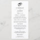 Chic black and white wedding menu features your starter courses, entrees and desserts in elegant lettering, accented with a hand drawn style illustration of an entwined wedding band and diamond engagement ring.