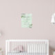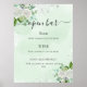 A watercolored green background, decorated with white florals, eucalyptus greenery, and faux silver glitter dust. Personalize and add your bar menu.