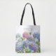 This elegant bridesmaid tote bag features gorgeous blue and lavender hydrangea flowers . At the top is a name and title of bridesmaid which may be personalized. Designed by world renowned artist ©Tim Coffey.