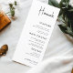 Modern black and white wedding menu featuring a minimalist layout with a stylish script name at the top for a chic, personalized touch. Perfect for weddings, bridal showers, or engagement parties, this elegant design pairs timeless monochrome with contemporary typography. A versatile choice for modern celebrations, from intimate dinners to formal receptions, creating a sleek and sophisticated dining detail.