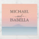 Beneath this elegant lettering unfolds a tranquil and misty blue sea, creating a serene atmosphere. Just above the horizon, an island emerges, adding a touch of distant allure and symbolizing the promise of a shared journey into the future. The real showstopper, however, is the sky above—a canvas painted in warm peachy hues as the sun gracefully sets. This magical sunset sky not only signifies the end of a day but also marks the beginning of a new chapter for the couple.