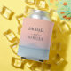 Beneath this elegant lettering unfolds a tranquil and misty blue sea, creating a serene atmosphere. Just above the horizon, an island emerges, adding a touch of distant allure and symbolizing the promise of a shared journey into the future. The real showstopper, however, is the sky above—a canvas painted in warm peachy hues as the sun gracefully sets. This magical sunset sky not only signifies the end of a day but also marks the beginning of a new chapter for the couple.