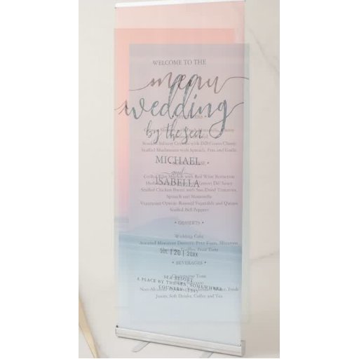 Beneath this elegant lettering unfolds a tranquil and misty blue sea, creating a serene atmosphere. Just above the horizon, an island emerges, adding a touch of distant allure and symbolizing the promise of a shared journey into the future. The real showstopper, however, is the sky above—a canvas painted in warm peachy hues as the sun gracefully sets. This magical sunset sky not only signifies the end of a day but also marks the beginning of a new chapter for the couple.