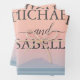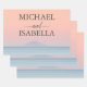Beneath this elegant lettering unfolds a tranquil and misty blue sea, creating a serene atmosphere. Just above the horizon, an island emerges, adding a touch of distant allure and symbolizing the promise of a shared journey into the future. The real showstopper, however, is the sky above—a canvas painted in warm peachy hues as the sun gracefully sets. This magical sunset sky not only signifies the end of a day but also marks the beginning of a new chapter for the couple.