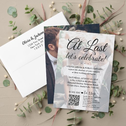 Invite family and friends to a simply elegant marriage celebration with a stylish modern "At Last Let's Celebrate" 2 photo all-in-one invitation with QR code RSVP. All wording is simple to personalize for any event type, including a reception only post elopement party, vow renewal ceremony, sequel wedding, 1st anniversary reception, cocktail hour or dinner party. (IMAGE PLACEMENT TIP: An easy way to centre a photo exactly how you want is to crop it before uploading to the Zazzle website.) By scanning the QR code with their phone, guests are sent directly to the wedding website to reply to the invitation. An online rsvp process reduces the chance that cards will be lost in the mail. It's also more versatile, in that you can ask for more detailed information, such as meal choices, food allergies, and song requests. All response information can be customized or deleted. The modern minimalist black and white text overlay design features two pictures of the newlywed couple, trendy handwritten script calligraphy, and chic typewriter style typography. This invitation is a stylish way of asking wedding guests to kindly reply to your upcoming special day celebration. Whether you eloped, had a smaller downsized minimony or micro wedding, or your special day celebration had to be rescheduled due to a covid pandemic postponement, the happily ever after party can still get started. Congratulations to the bride and groom!