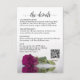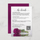 This beautiful wedding enclosure card is designed to give you extra space for whatever information your guests may need, including RSVP, registry, reception, travel, accommodations, etc. as well as a customizable QR code directing your guests to your website for more information. The card features a gorgeous design with a single magenta, berry, or cassis purple coloured rose and a lacy script calligraphy title reading "the details."