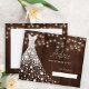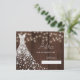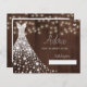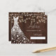White shiny diamonds wedding dress on a dark brown barn wood with strings of twinkle lights background making a rustic modern elegant bridal shower advice card.