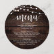 Modern Rustic Cottage Dark Brown Wood, String Lights, Round Plate shapes, Wedding elopement Dinner Menu. A perfect bar menu for your big day. You can change the script font colours and change the menu contents and fonts to meet your needs.