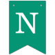 A simple bunting flags banner for a emerald green wedding, with the names of the bride and groom, with white caps on teal background.