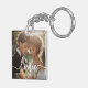Keychain featuring your custom photo with white text overlay “love” in an elegant script font and the names and date below.