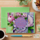 Beautiful & Elegant, Boquete of Pink & Violet Peonies with Satin Violet Bow at Bottom, surrounding A (Violet) Circle Horizon, topped with "Our Wedding" & "Date", on Layered (Two Shades at Top) Violet background.