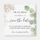 A trendy wedding Save the Date magnet. A stylish white background decorated with eucalyptus foliage and faux gold glitter dust. Personalize and add a date, names and text. The text: Save the Date is written with a large trendy hand lettered style script with swashes.