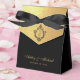 An elegant black and gold wedding favor box. The flap is faux gold foil and it has a black crest with the wedding monogram in it, from the two initials of the bride and groom.