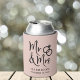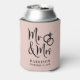 Give a wedding toast and your wedding guests a fun souvenir keepsake of your special day with this custom blush pink can cooler with "Mr & Mrs" written in a large script and an illustration of two wedding rings joined together. Add your name and wedding date.