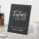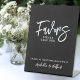 This custom table sign features a simple black and white design with a clean black background and crisp white fonts for a timeless look. “Favours” is displayed in large handwritten script, while “Please Take One” appears below in a classic serif font for a balanced and elegant touch. At the bottom, the bride and groom’s names are shown in a coordinating handwritten script.
