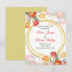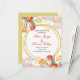 "Vibrant wedding invitation adorned with colorful tulips in shades of red, orange, yellow, and pink, beautifully framing the text within elegant golden circles. The combination of floral artistry and refined typography creates a joyful and romantic design, perfect for celebrating love in style."