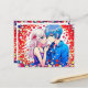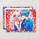 Personalized thank you notes for your anime themed wedding. Red, blue and white flowers and a cute anime couple cuddling.
