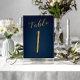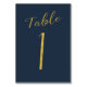 Faux gold foil formal calligraphy script wedding reception table card. The navy blue background colour is editable. You can change it after selecting CUSTOMIZE FURTHER button.