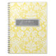 Spiral wedding guest book notebook in elegant bright canary yellow, grey and white classic floral damask vintage pattern. Customizable with your names and wedding date.