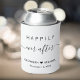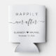 White wedding can cooler party favours with "Happily Ever After" in a mix of simple typography and a stylish script with swashes, your first names and the date joined by a heart. Perfect for your wedding reception, engagement parties and couples shower.