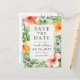 Post cards are an economical option when sending Save the Date Cards for your wedding. This vibrant aloha style design sets the tone for your tropical themed wedding with watercolor hibiscus in peachy pink and orange and tropical palms and other foliage. It's a perfect choice for beach weddings, destination weddings, tropical-theme weddings, luaus and more. Personalize the front of the post card with your names, wedding date, and location by editing the sample text in the easy-to-use design template. Move on to Side 2 and personalize the return address and sample message to your guests. Aloha!