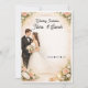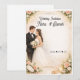 A stunning and sophisticated wedding invitation design featuring a romantic illustration of a bride and groom surrounded by a lush arrangement of white and light pink roses.