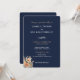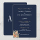 Dark blue invitation for weddings, with watercolor apricot flowers and garden foliage. A simple yet elegant contemporary botanical design inspired by boho vintage style, with monogram on the back.