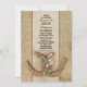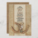 rustic country wedding invitation with burlap background texture and old horseshoes couple.