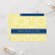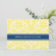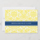 Wedding invitation cards in elegant and contemporary bright lemon yellow, dark navy blue, and white classic and chic floral damask vintage pattern. Customize these invitations with your wedding details. Available in matching products for all of your wedding needs.