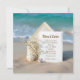 A blank card and envelope rest on a sandy beach surrounded by seashells, a starfish, and a turquoise ocean background for a wedding invite.