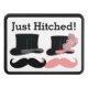 Perfect gift for the newly married or engaged wedding couple. Just Hitched features a black top hat, black moustache, pink top hat with feather and flower and a pink moustache. Great for moustache bash and all types of frivolity. Great for Victoria, Steampunk, formal and other themes.