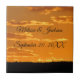 This vibrant wedding keepsake tile features a bright orange and yellow sunset photo. The photo captures the orange and yellow colours created by the setting sun as it lights the horizontal clouds that span the sky. The landscape appears in silhouette along the bottom of this vivid tile memento. Personalize with the bride and groom's names and wedding date quickly and easily.