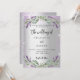 A modern, stylish wedding invitation. A faux silver looking background with violet faux glitter, sparkles, lavender florals, flowers and eucalyptus greenery. Personalize and add your names and the details.