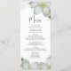 This design features a wedding menu, with elegant, calligraphy, and a simple white background with magnolia flowers, magnolia greenery, and floral accents, perfect for reception decor
