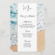 This Menu Card template is shown in the basic matte paper with a lovely beach photo print with script and standard text in black.