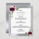 An elegant bohemian boho style wedding menu card. Feathers and lush watercolored roses in burgundy. Templates for your names, date and the wedding menu. A faux silver and white frame and a chic, glamourous faux silver metallic looking background colour. Black coloured letters.