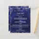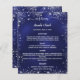 A classic wedding menu. A navy blue background, decorated with faux silver glitter sparkles. The blue colour is uneven. White text. Personalize and add your name, date and the menu.