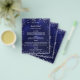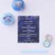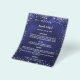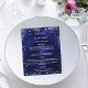 A classic wedding menu. A navy blue background, decorated with faux silver glitter sparkles. The blue colour is uneven. White text. Personalize and add your name, date and the menu.