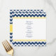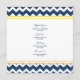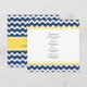 Wedding dinner menu in elegant dark navy blue, bright lemon yellow and white with fun retro chevron zigzags pattern, customizable with your details and available in matching wedding products.