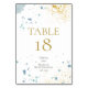 Wedding Table Number Card | Rustic and modern blue and gold paint splatters sets off the wedding tables in style. Reverse is a the same. Customize text, font style, colour and size. Original painted artwork created for the BarefootBride™ by © WhimsicalArtwork™ - This is part of a complete Wedding Stationery Suite with matching wedding, baby shower and other event stationery. #watercolor #wedding #denimblue #blueandgold #tableNumber