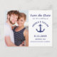 Announce your engagement to be married with this nautical themed save the date announcement postcard. This design features your photo on the left and to the right is your engagement details in navy blue typography accented by a navy blue anchor and your personalized wedding details. The back of the postcard has more of your wedding details to customize. Designed by artist Susan Coffey.