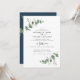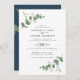 Eucalyptus Greenery foliage modern minimal garden party Wedding Invitations. Simple elegant botanical design available in contemporary navy blue, white, sage green and black colorway