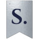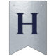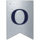 A bunting flags banner for a wedding with navy and silver wedding colours, with the words "Mr. & Mrs." and the family name of the new couple and 3 hearts. The text is in navy blue caps on faux silver foil background,  the hearts and the ampersand are faux silver foil on navy blue background.